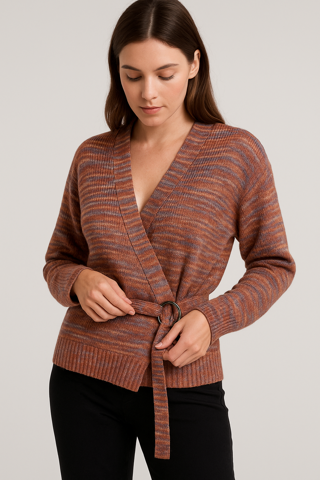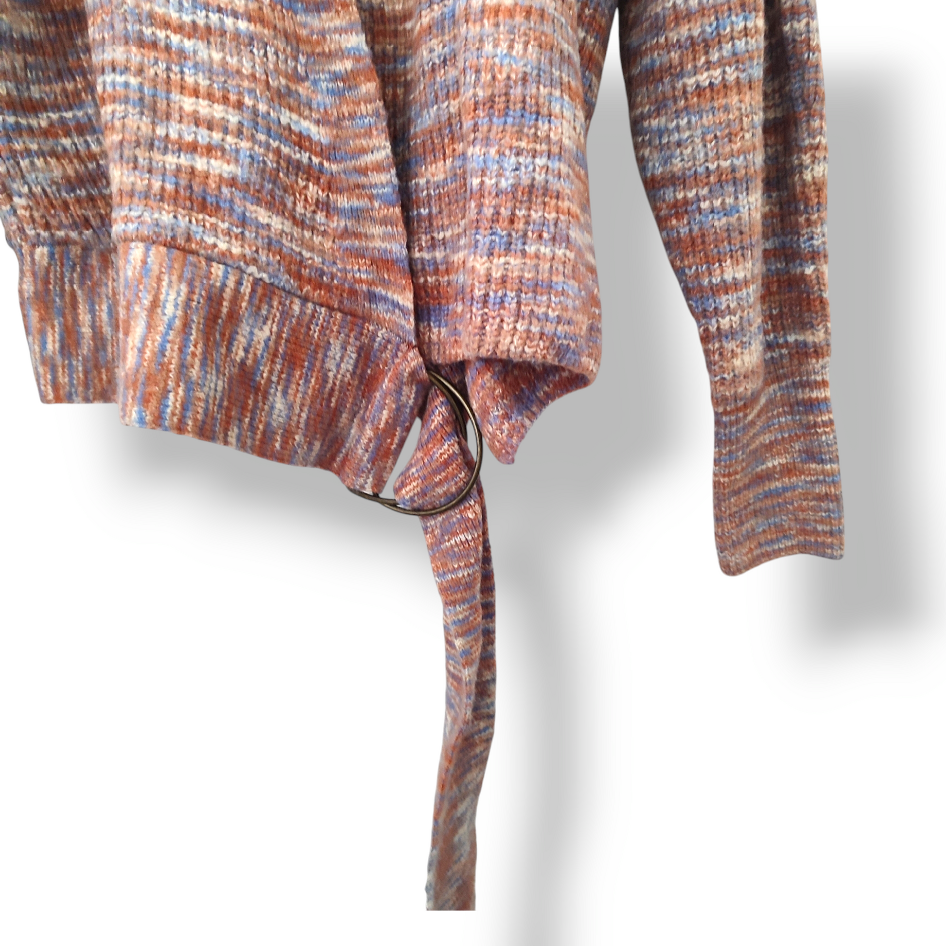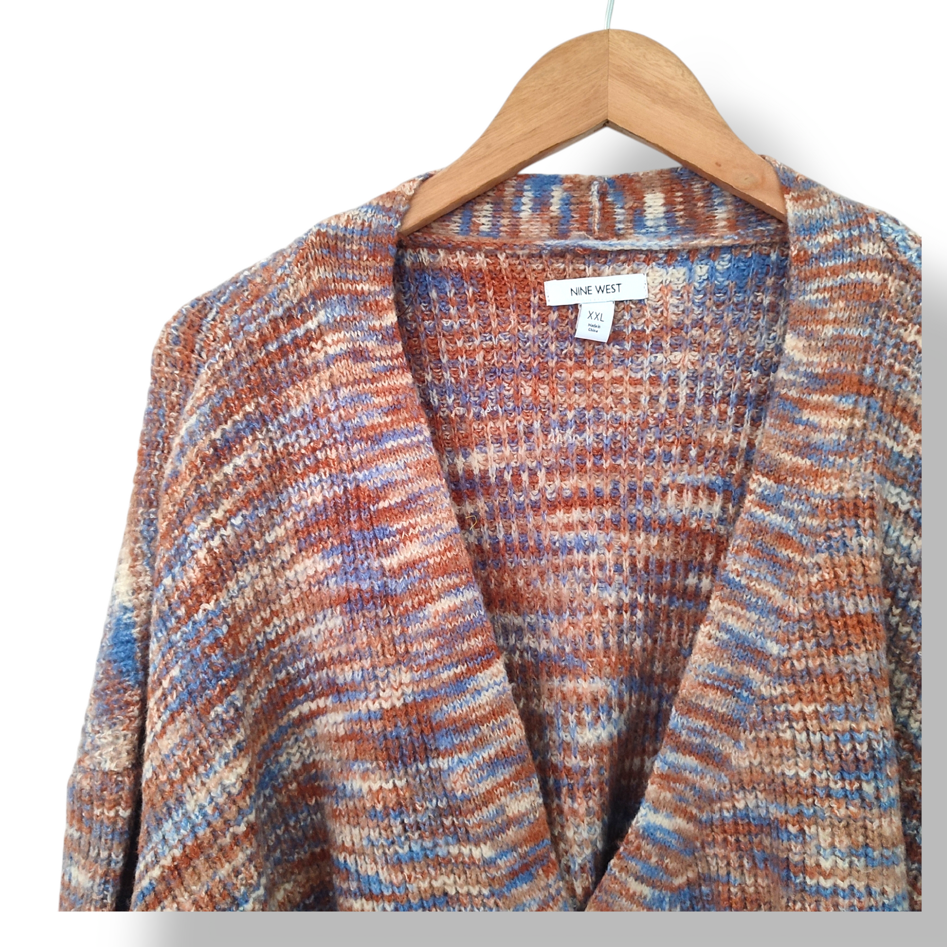 Este cárdigan de Nine West tiene un corte cruzado y un tejido jaspeado en tonos tierra y celeste, lo que lo convierte en una opción ideal para el otoño e invierno. Su longitud llega a la cadera o un poco más abajo, brindando comodidad y estilo. ¡Añádelo a tu guardaropa para completar tus looks de tonos terrosos!